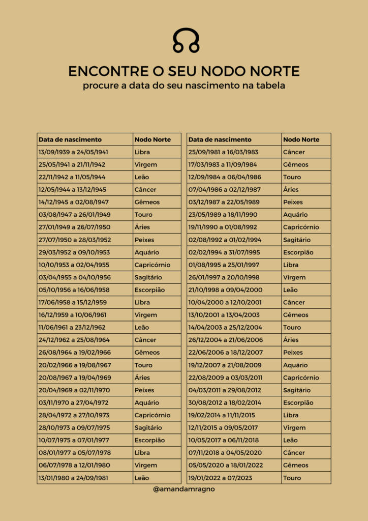 Se você ainda não sabe qual é o signo do seu Nodo Norte, procure a sua data de nascimento na tabela abaixo. Lembre-se: é comum que o signo do seu Nodo Norte seja diferente do seu signo solar.